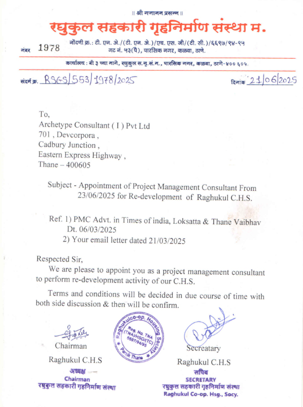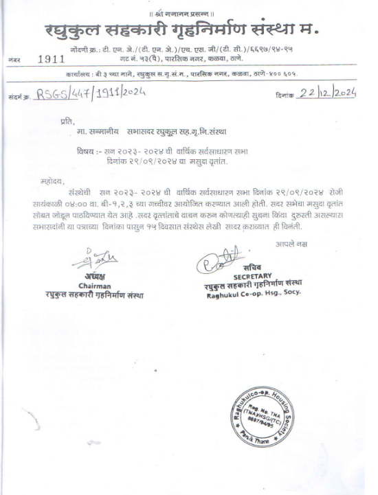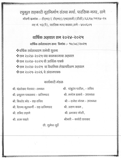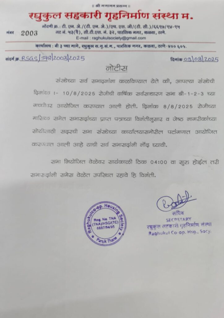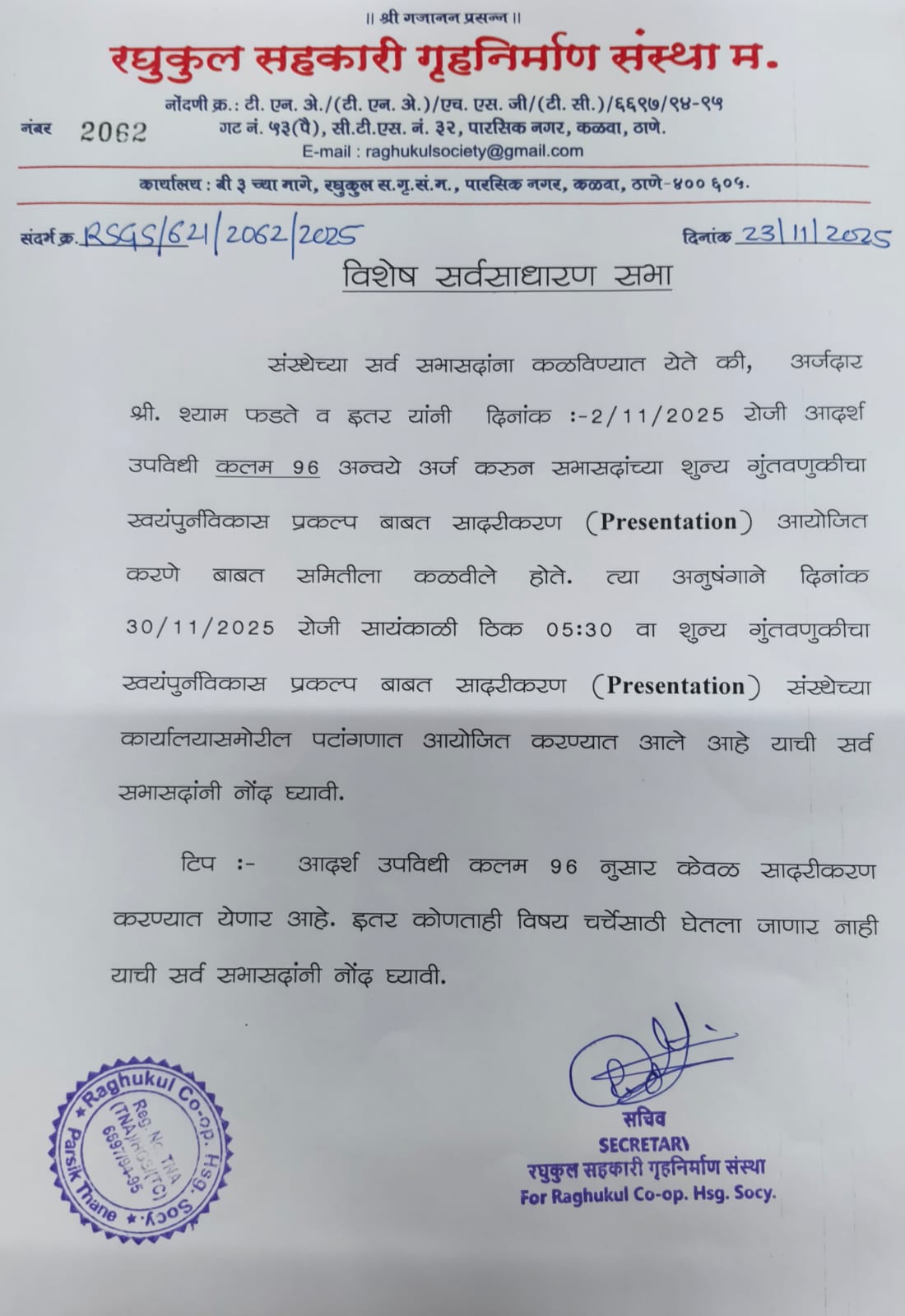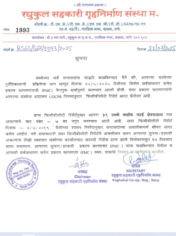 १० ऑगस्ट २०२५ रोजी झालेल्या वार्षिक सर्वसाधारण सभेत रघुकुल सोसायटीच्या पुनर्विकासासाठी कायदेशीर सल्लागार म्हणून यांची नेमणूक केल्याचा ठराव मंजूर करण्यात आला होता. सभासदांच्या सूचनेनुसार त्यांनी दिलेली माहिती सर्वांसमोर आम्ही सादर करीत आहोत. वरील विषया नुसार आपण संस्थेच्या कार्यालयात १५ दिवसाच्या आत तपासणी केल्याची माहिती लिखित स्वरूपात सादर करावी ही विनंती.