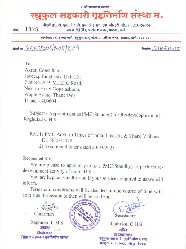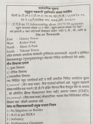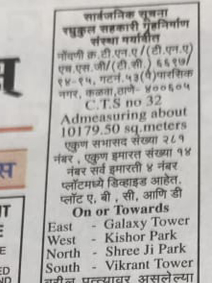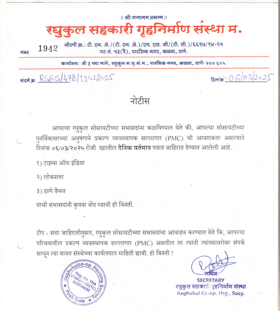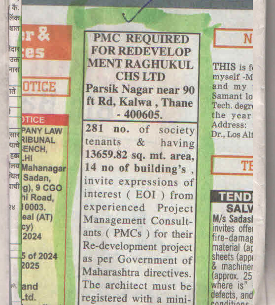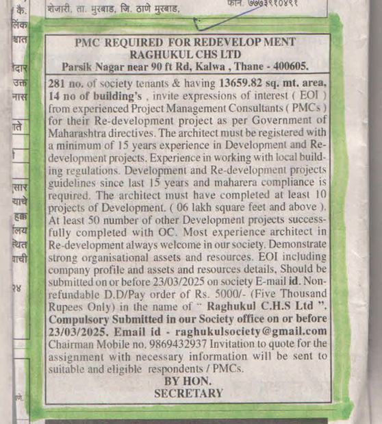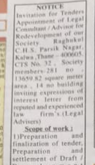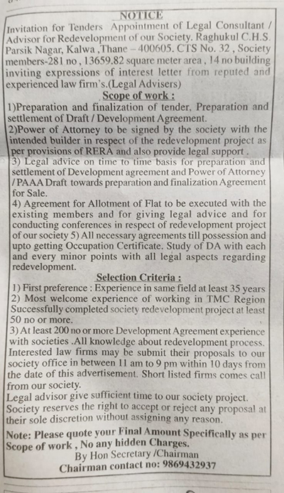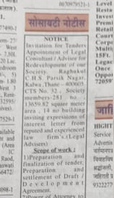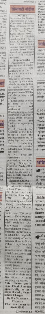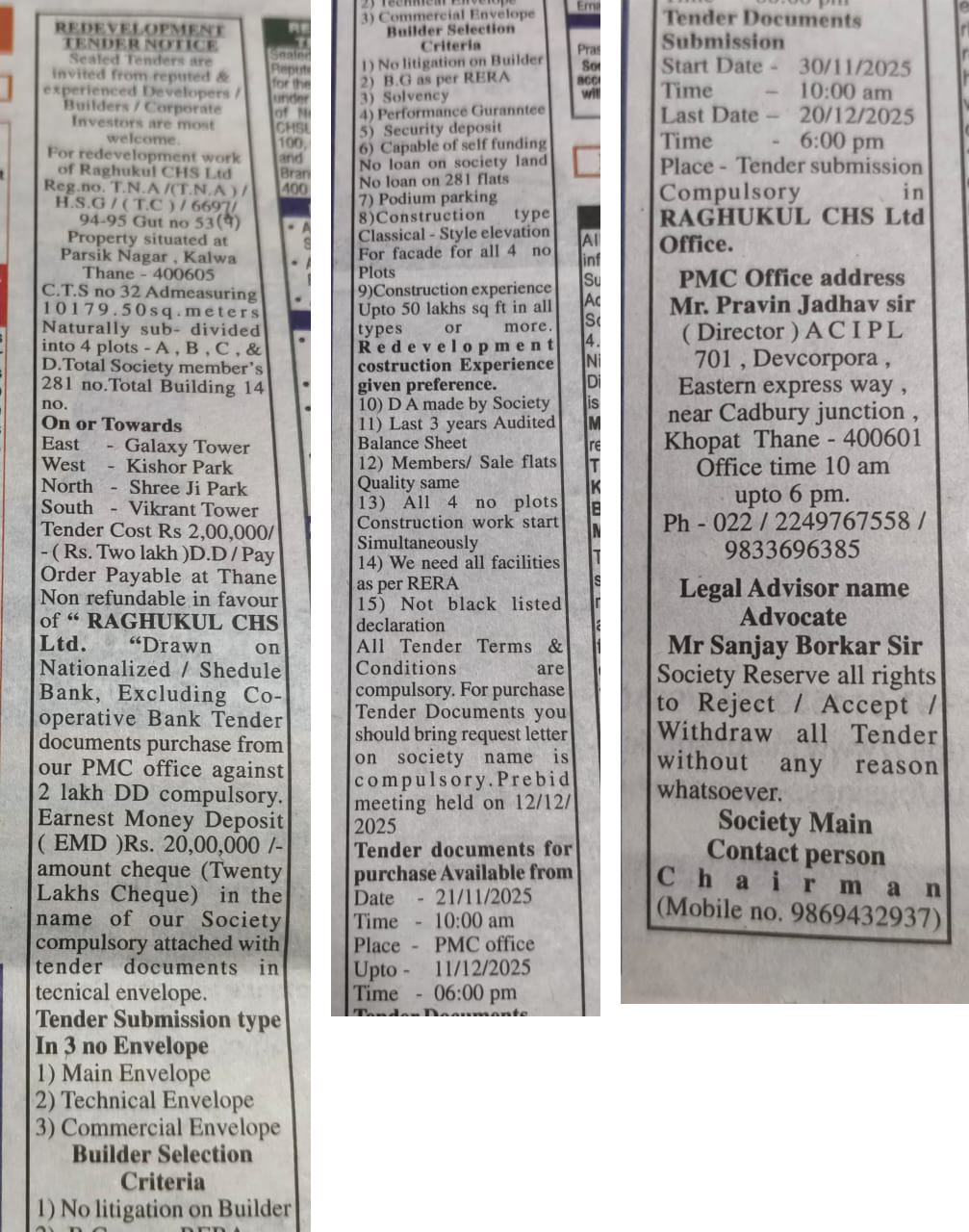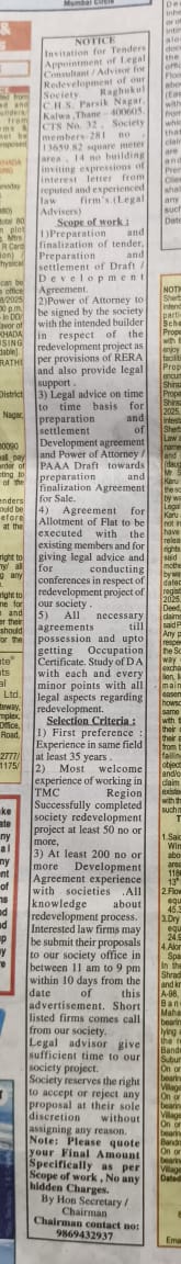 रघुकुल सोसायटीच्या पुनर्विकास प्रक्रिया राबवण्याबाबत व संस्थेच्या सभासदांचे कायदेशीर हितरक्षण करण्यासाठी संस्था तज्ञ / अनुभवी वकील / वकीली फर्म / कायदेशीर सल्लागार ची आपल्या सोसायटीसाठी नेमणूक करु इच्छिते. त्या अनुसरून वरील जाहिरात टाइम्स ऑफ इंडिया ( पान नंबर १० वर ) लोकसत्ता ( पान नंबर ०८ वर ) ठाणे वैभव ( पान नंबर ०२ वर ) ह्या न्यूजपेपर्स मध्ये आज रोजी देण्यात आलेली आहे. ( दिनांक २३-०७-२०२५ )