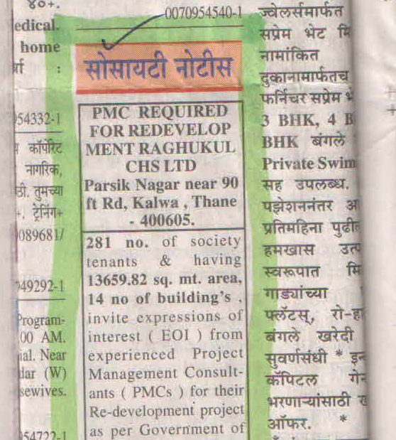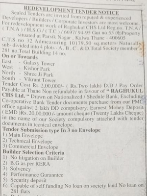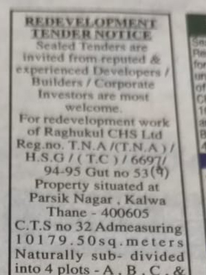 रघुकुल सोसायटीच्या पुनर्विकासाबाबत निविदे ची जाहिरात वरील वृत्तपत्रांमध्ये आज प्रसारित करण्यात आलेली आहे.