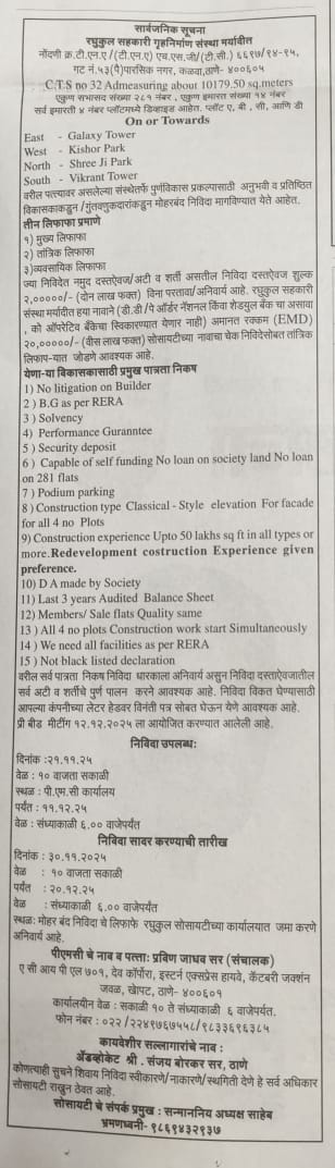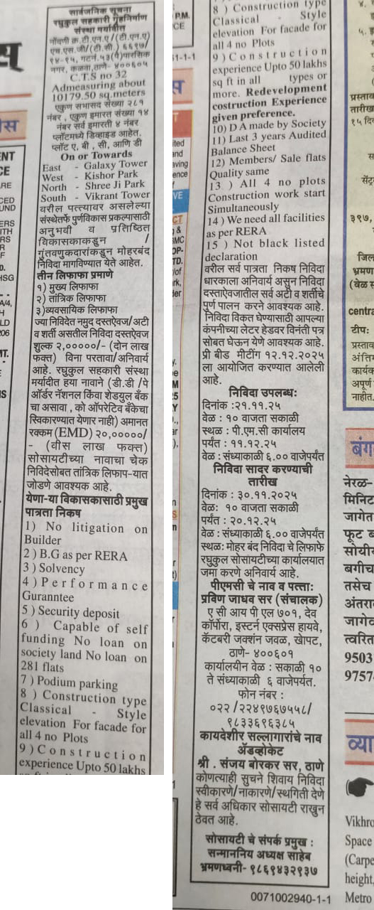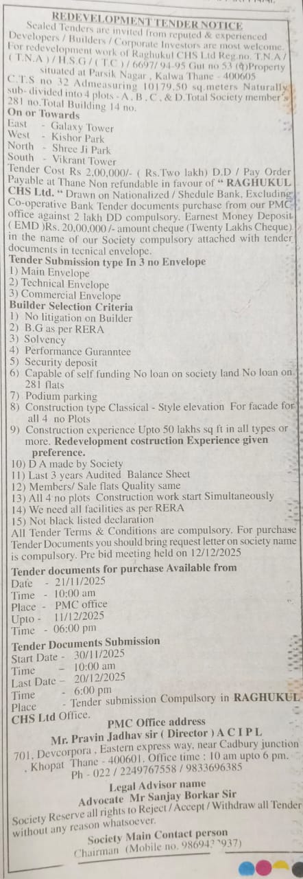 रघुकुल सोसायटीच्या पुनर्विकासाबाबत निविदे ची वृत्तपत्र जाहिरातदिनांक - २१/११/२०२५
